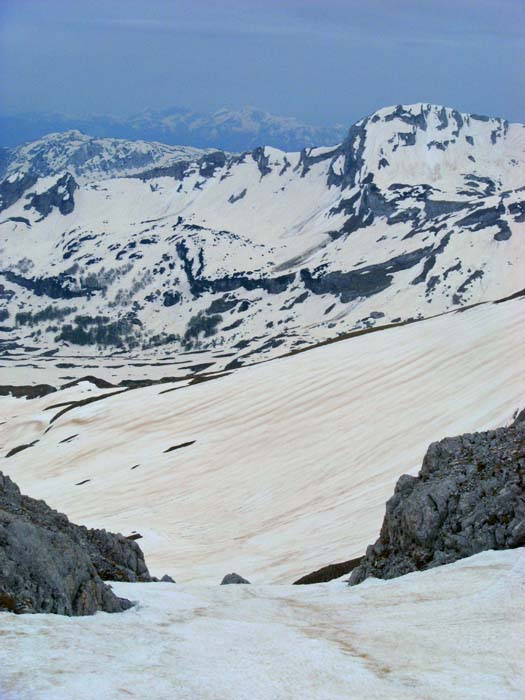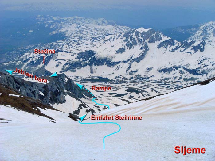 Erich bricht relativ spät am Nachmittag noch zu einer Erkundungstour auf. Auf der Stožina, einer an sich unbedeutenden, dafür aber umso keckeren Hauptkamm-Rückfallkuppe, gehen ihm die Augen über. An einem der darauf folgenden Tage werden zwei der vielen bettelnden Linien zusammengefasst und in die Tat umgesetzt: Aufstieg zu Fuß über den felsigen Jablan-bara-Grat auf den zentralen Westgipfel des Sljeme. Das weiträumige Gipfelplateau dieses Berges bildet die dritthöchste Erhebung im Durmitor, nach Bobotov kuk und dessen nördlichen Trabanten Bezimeni vrh. Bei der Abfahrt bleiben keine Wünsche offen, sie erinnert an die schönsten Frühjahrstouren etwa im steirischen Hochschwab. Ein traumhafter Gipfelhang, eine extreme Steilrinne (welche man notfalls orographisch rechts umfahren kann) hinunter ins Große Lomnidokar, ein kurzer, harmloser Gegenanstieg in den bereits bekannten NW-Sattel unter der Stožina und eine neuerliche Abfahrt hinunter zur Sedlostraße, vorbei an dem stolzen Zapfen, an dem alles begann.