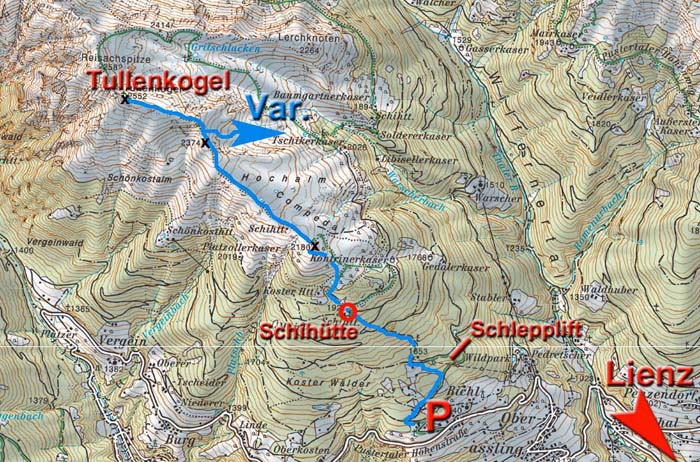 P Compedal Rodelbahn, 1460 m, westl. oberhalb v. Weiler Bichl, 3 km nw. v. Assling (Pustertaler Höhenstraße); alternativ Tourengeher-P beim Wildpark Assling (Schlepplift) - Forstraße = Rodelbahn zum Liftausstieg und weiter zur Schihütte, 1921 m - SO-Hänge Compedal - Hochalm - Tullenkogel.