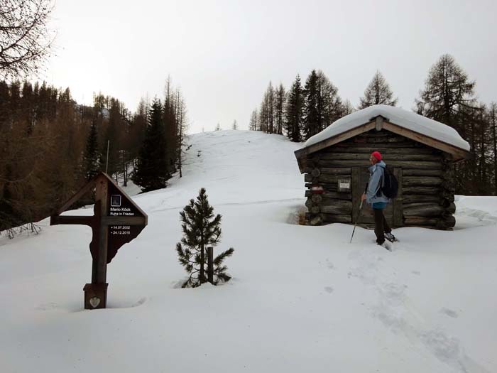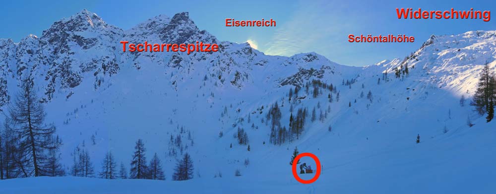 Zum Jahresbeginn schaufelt ein Genuatief gewaltige Schneemassen in den Süden unseres Landes. Das Gailtal liegt an vorderster Front und bekommt daher noch mehr ab als der Rest von Osttirol, Dutzende umgedrückte Bäume versperren den Forstweg ins Schustertal, der Zugang zum Weißen Knoten gleicht dem Vordringen zu einem streng gehüteten militärischen Geheimnis. Erst knapp an der Waldgrenze schält sich unser Berg aus seiner Tarnung, die kecke Nase gewinnt mehr und mehr an Reiz, je näher wir ihr kommen. Zuletzt wendet sich die Spur gar vom Ziel ab und zieht auf eine gut 20 m höhere unbenannte Schulter am Ansatz des Widerschwing-Nordkammes hinauf. Minuten später finden wir des Rätsels Lösung. Die Schulter ist problemlos erreichbar, der Weiße Knoten setzt an seinem gut 30 m hohen Gipfelturm alpine Akzente, die oberen Meter sehr steil, die letzten paar Schritte zum luftigen Kreuz wirklich ausgesetzt.