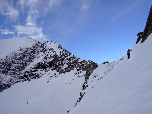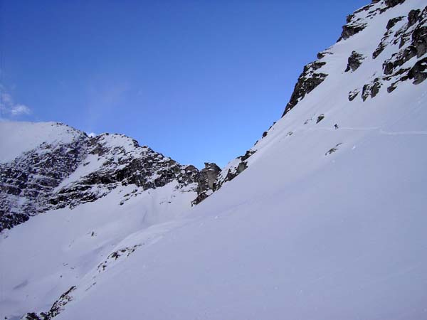 Weit über 200 m fällt das Gelände südlich der Scharte in mehreren Wandstufen zum Unteren Schwarzsee ab, der Sommerweg kann auf diesem Abschnitt und auch weiter bis zum Oberen See und zur Muritzenscharte getrost als Klettersteig bezeichnet werden. Vor fünf Monaten haben wir zwischen den einzelnen Wandgürteln ein steiles, schrofiges Bändersystem ausgemacht, das im Winter den einzig praktikablen Weg zum See hinunter darstellt – natürlich nur bei optimalen Verhältnissen.