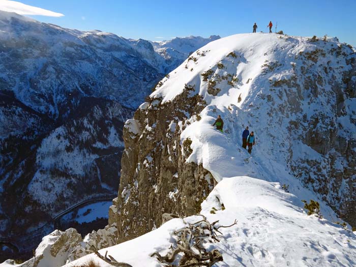 Die folgenden Aufnahmen sind ein Mix aus unserer ersten Befahrung im Spätwinter 2005 und der Tour mit Ullis Vater und Erichs Sohn Nikolaus zwölf Jahre später. Das Abenteuer hat in der Zwischenzeit nichts an Attraktivität eingebüßt. Nach dem kalten Bärenbachtal genießen wir am letzten Teil des Aufstiegs die Sonne, bei der Abfahrt durch die Mitterhalt-Nordwestrinne hält sich bei anregender Steilheit lange herrlicher Pulver - Nikolaus (am Splitboard) haben wir in den 20 Jahren seines Daseins kaum jemals glücklicher erlebt als in diesem weißen Wunderschlauch. Aber auch die potenziellen Gefahren sind nicht weniger geworden: Vor den paar Schritten hinüber zum Kreuz des Gipfelturmes kann ohne Steigeisen nicht eindringlich genug gewarnt werden; bei unsicheren Verhältnissen sind auch die bewaldeten Steilflanken links und rechts der Rinne keine Lebensversicherung. Die lange Forststraße hat - bis auf die letzten paar Schritte - auch für Snowboarder ausreichend Gefälle.