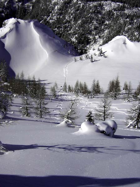 beim längeren Forststraßenaufstieg durchs Bärenbachtal hat man den gewaltigen Koloss der Riegerin (s. Archiv Bergsteigen) ständig hinter sichunterm Bärenbachsattel, dahinter Hochstadl und Tannsteinvom oberen Teil der Forststraße führen oft mehr oder weniger sportliche Abkürzerspuren ...... direkter durch den Wald hinauf; die Gipfel der Kräuterin überragen unsere kleine GruppeFarnerwiese gegen MitterhaltWintermärchen auf der MitterhaltMitterhalt gegen HochstadlBlick von der Mitterhalt zum Gipfelam Gipfelkamm schon zum Greifen nahe die Hochschwab Nordabstürzeder Gipfelturm von NordenGipfelblick gegen OSO: links der Mitte die Veitsch, rechts die Hohe Weichselim Süden die zentralen Hochschwabgipfel ...... und unter uns bizarre Felskulissender kurze Übergang zum Gipfelkreuz lässt selbst bei ausgetretener Spur nicht mit sich spaßenGipfel gegen NW (Hochstadl); wir rutschen zurück auf die Mitterhalt, ...... von der wir gleich nordwestlich hinunter in die kraterartige Mulde schwingen werdendurch lichten Baumbestand geht's hinunter in die Muldewir peilen den schmalen Sattel mit der Einfahrt in die NW-Rinne anwenige Schritte in den Sattelbald verbreitert sich die schmale, trogförmige Einfahrtnach wenigen Schwüngen schon hat man die Wahl ...... zwischen der freien Rinne rechts und dem schütter bewaldeten, etwas weniger steilen Sporn linksUlli in den Lärchenhängen des oberen Spornesparallel dazu Nikolaus 50 m weiter nördlich in der Rinneim Mittelteil der Rinne ...... verfehlt Ulli ganz knapp einen schönen Pillowsprungnach knapp 500 Höhenmetern wird die Rinne zu einem schmalen, gewundenen Trogtalder Auslauf der Rinne am Eckstein, kurz vor der Forststraßedie Rinne war ihr nicht steil genug; Ulli beim virtuosen Abkürzen einer Forststraßenkehre