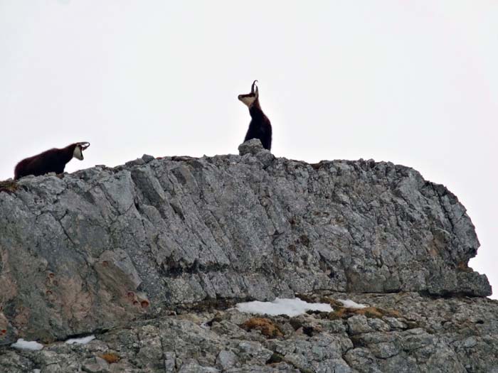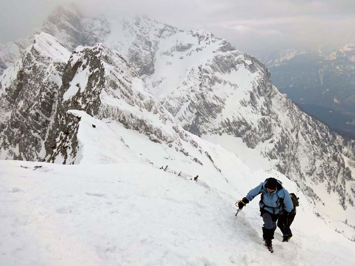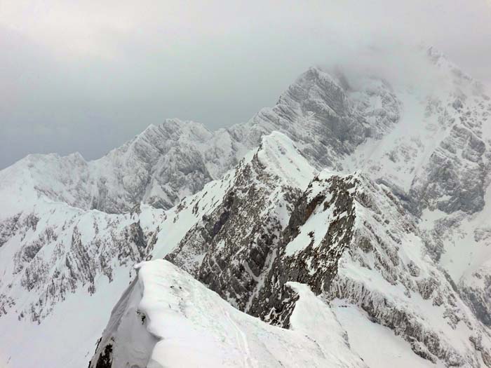 Wir erwischen Mitte März sehr durchwachsenes Wetter, trotzdem zieht uns immer wieder der fotogene, eisgepanzerte Verbindungsgrat zum Gr. Pyhrgas in seinen Bann. Zur Sommerbegehung dieses kühnen Firstes gibt's einen Bericht samt Video im Archiv Bergsteigen (s. Link oben).